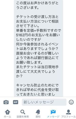 Twitterでフェスのチケットを譲ってもらえることになってdmでやり取り Twitter 教えて Goo